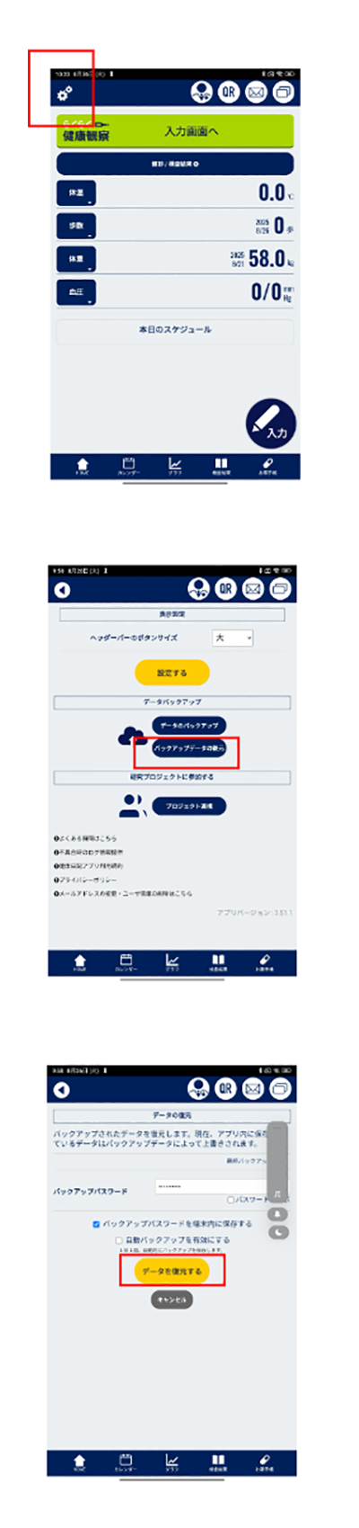 健康日記HOME画面左上の設定ボタンをタップし、設定画面内にある「バックアップの復元」をタップ。「データを復元」をタップしてください。